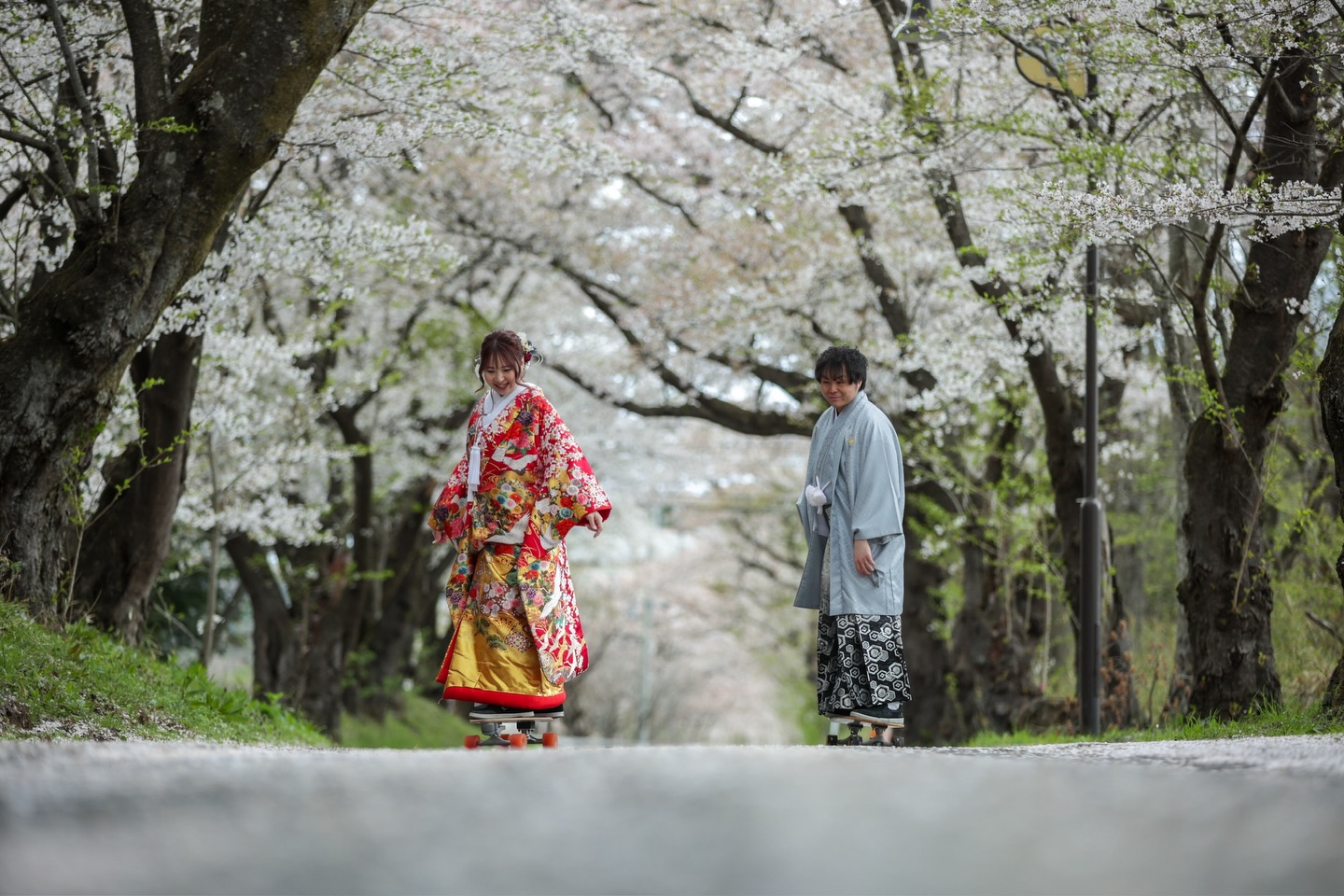 桜に囲まれたウエディングフォト、