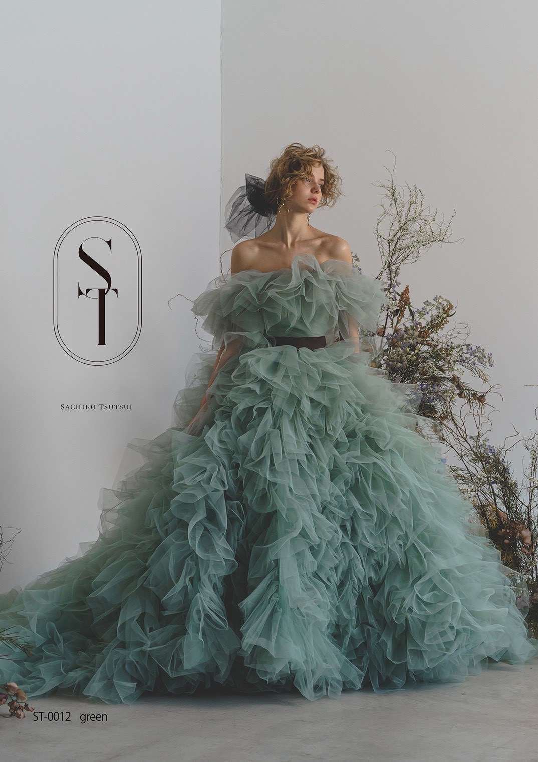 柔らかくくすんだトーンが印象的な、スモーキーカラーのチュールドレス。