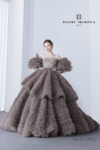 ボリュームがありながらも軽やかさを感じさせるデザインで、特別な一日をよりドラマティックに彩る一着です。