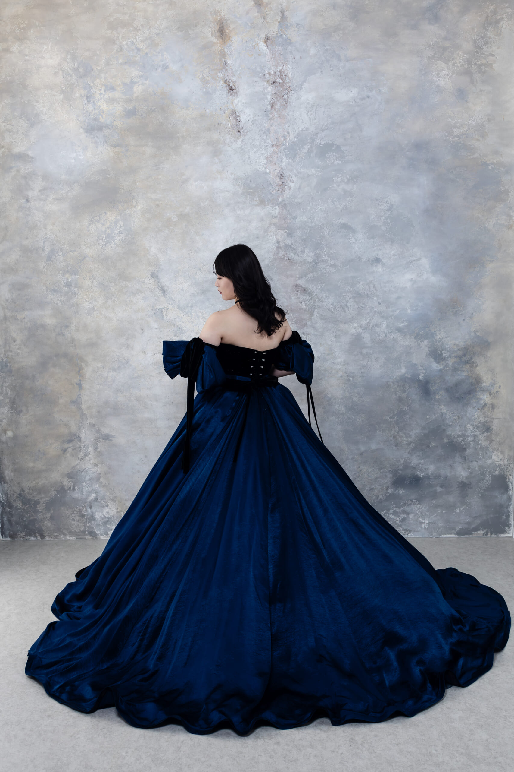 深みのあるネイビーカラーが上品なカラードレス。 オフショルダーのデザインとコンパクトなトップスが、デコルテを美しく引き立てるシルエットに。 光沢感のあるボリュームスカートとロングトレーンが、落ち着きの中にも華やかさを演出する1着。