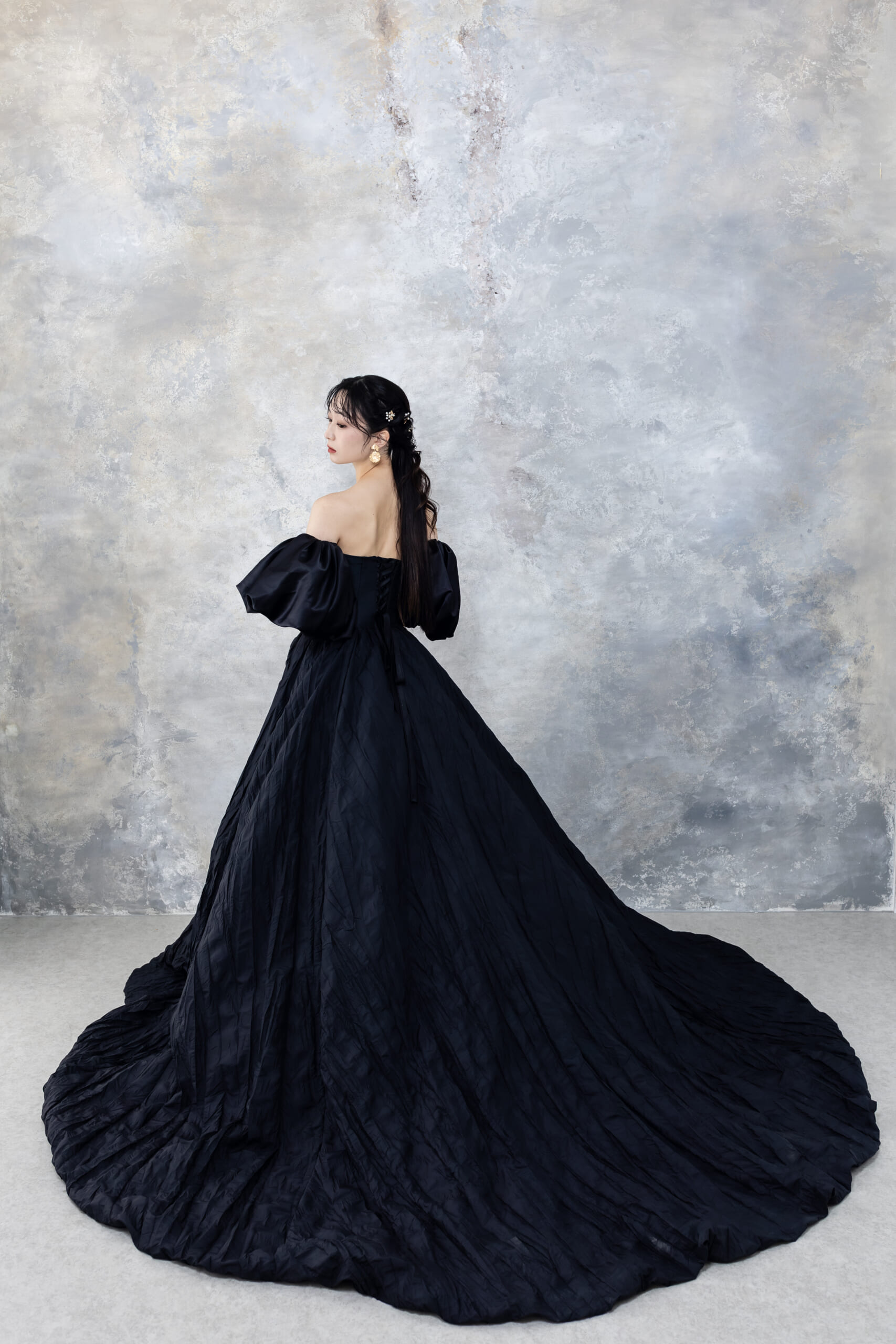 深みのあるブラックが印象的なカラードレス。 オフショルダーのボリュームスリーブがデコルテを引き立て、立体感のあるシルエットに。 ハリ感のある素材とロングトレーンが、シンプルながらも存在感のある上品な1着。