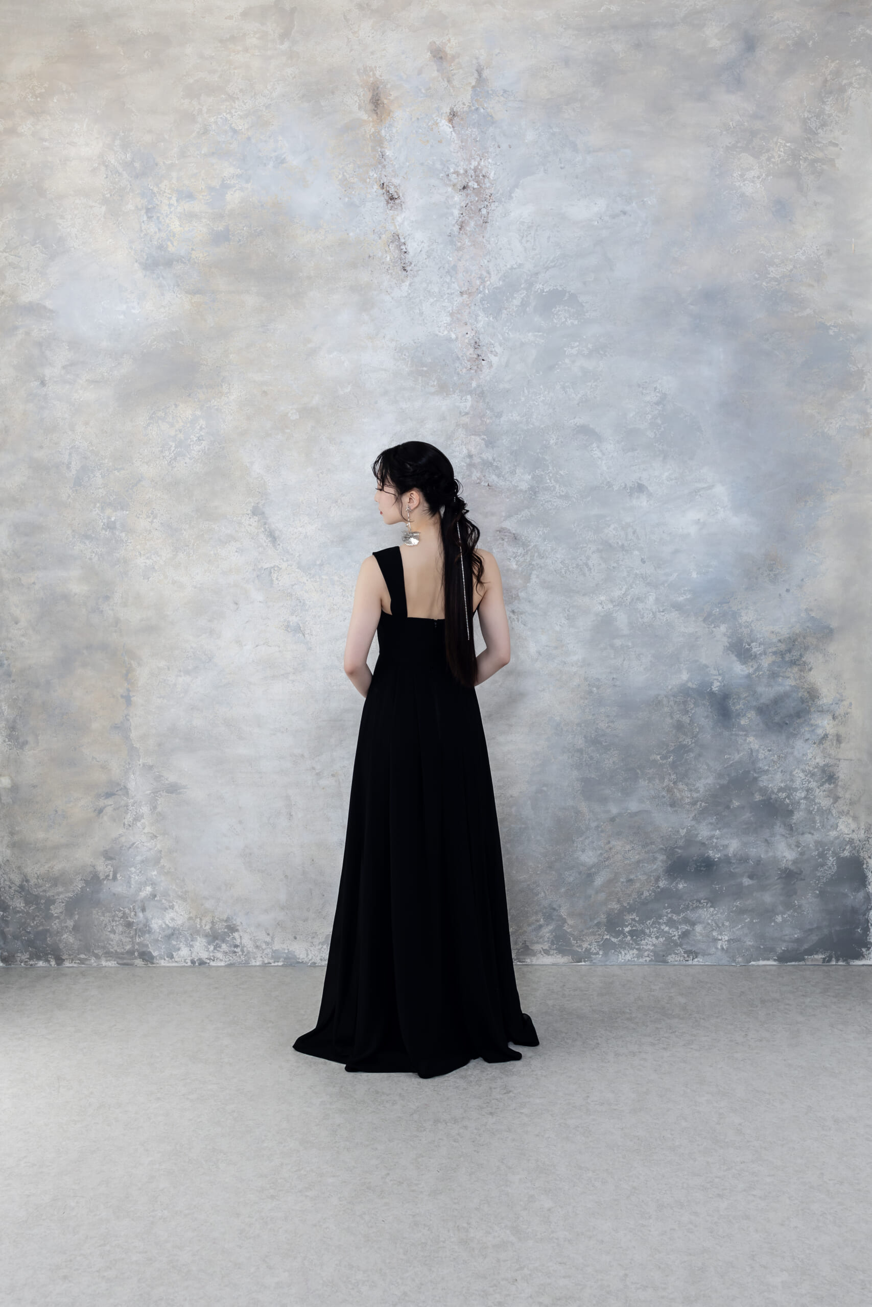 シックなブラックカラーが引き立つカラードレス。なめらかな質感と控えめな光沢が、品のある仕上がりを演出。アシンメトリーなワンショルダーデザインがアクセントとなり、すっきりとした美しいラインを際立てる1着。