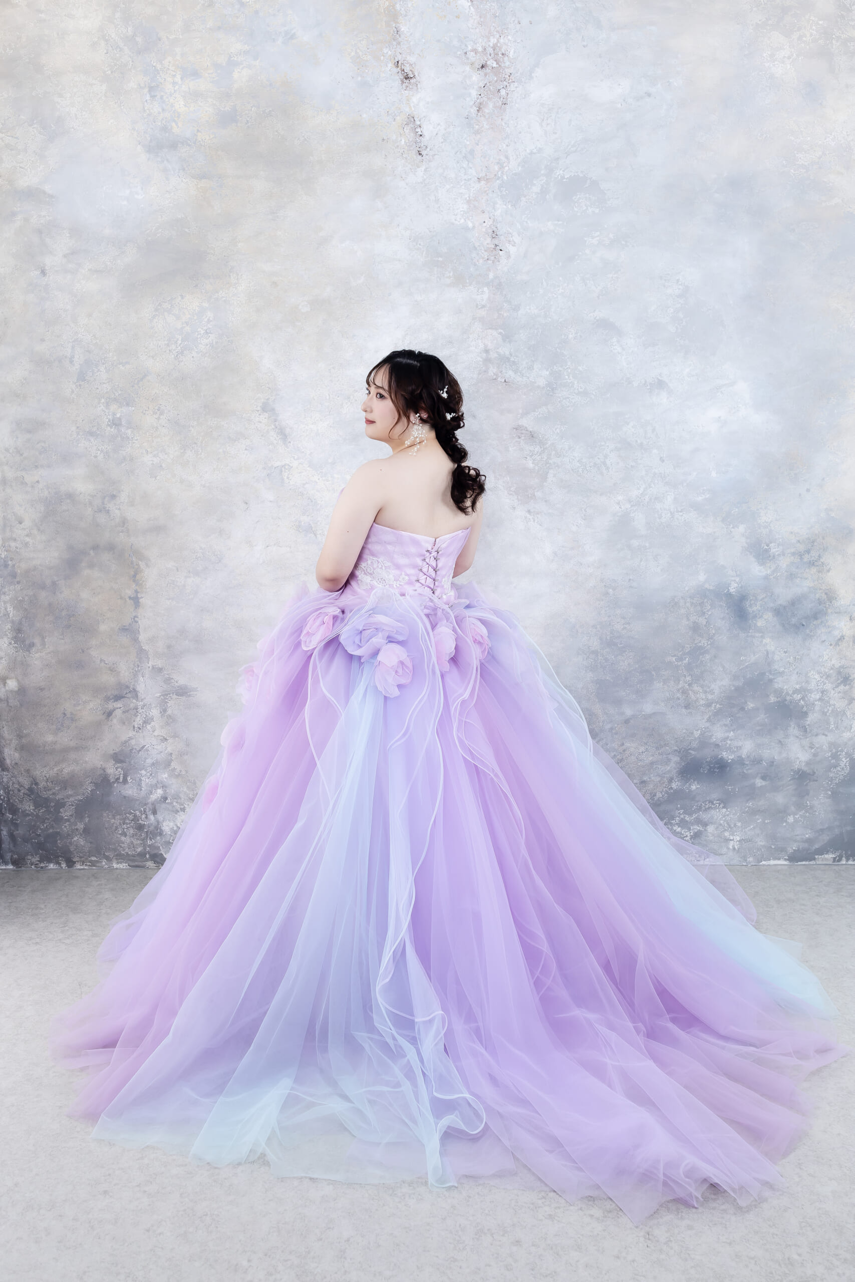 ふんわりと広がるパープルチュールがパープルチュールが主役のドレス。 柔らかなグラデーションが透明感を引き立て優しい印象に