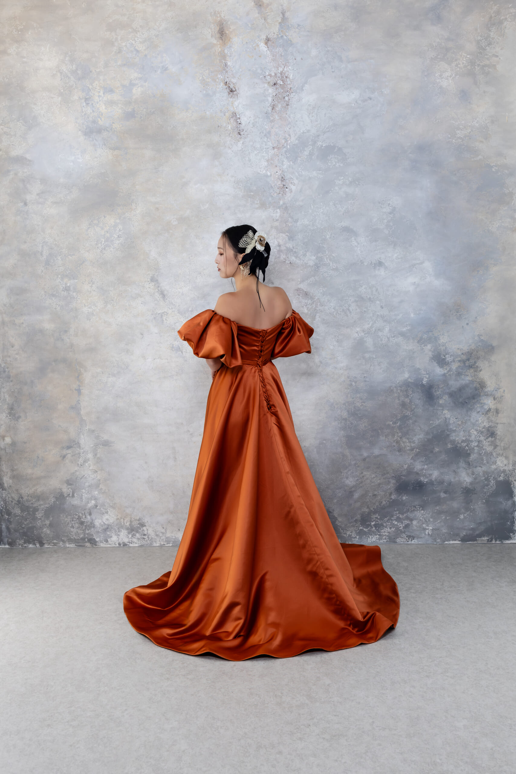 深みのあるテラコッタカラーが印象的なカラードレス。光沢感のある素材が美しく、落ち着きのある上品な印象を与えます。ボリュームのあるスリーブとオフショルダーデザインがアクセントとなり、洗練されたスタイルに仕上がる1着。