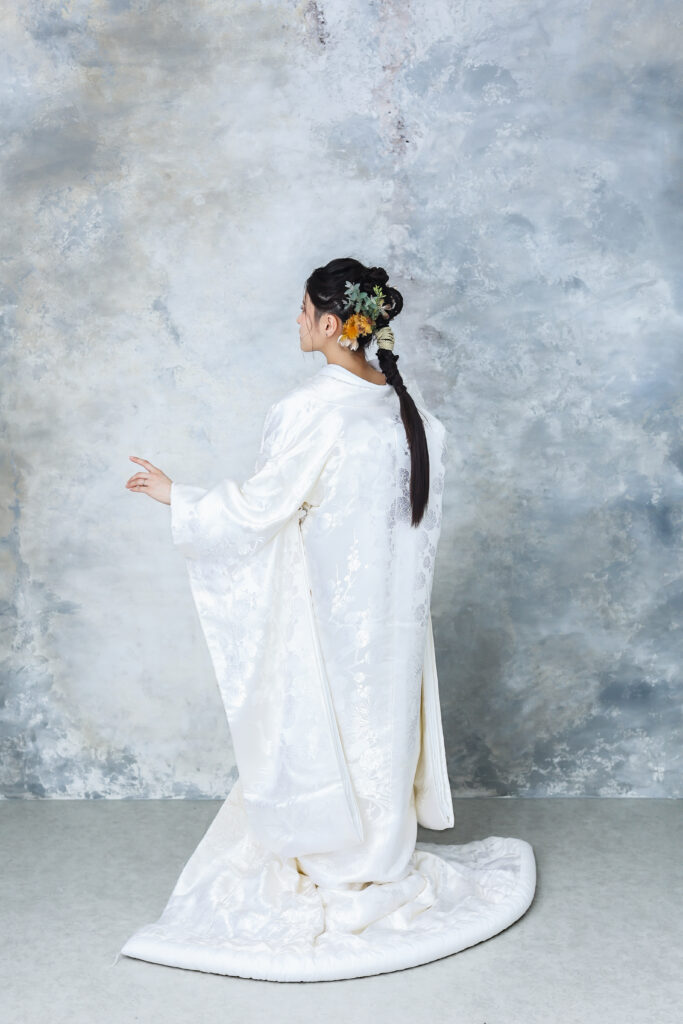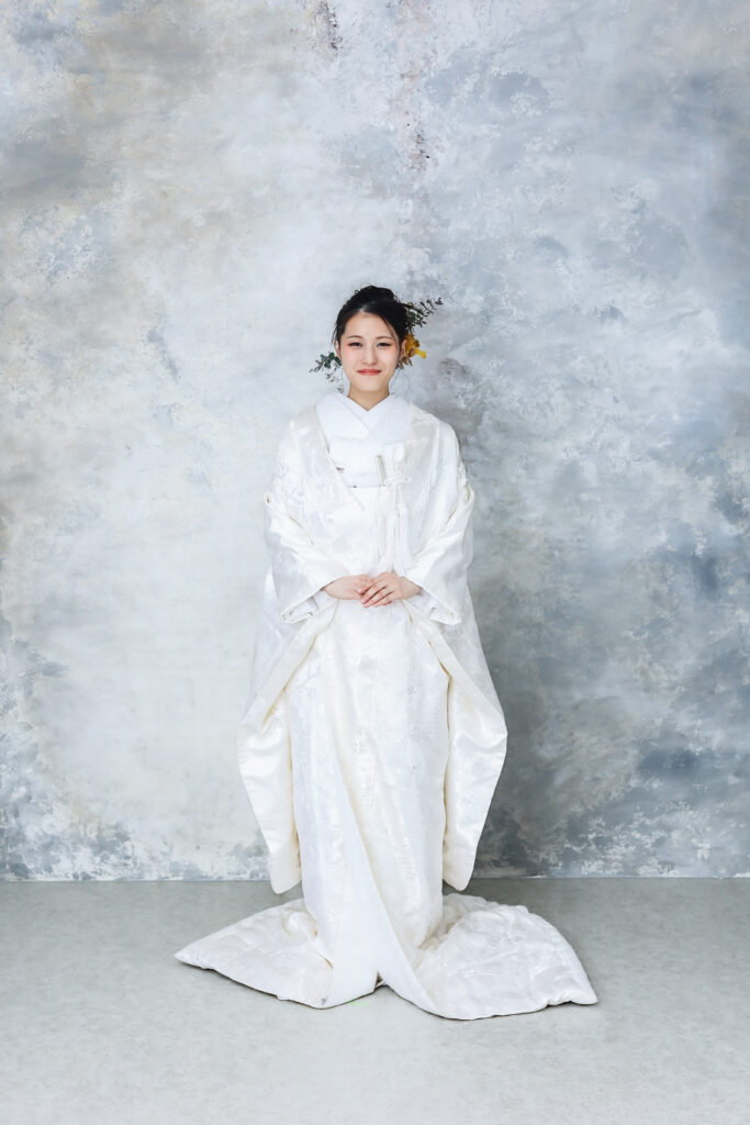 この白無垢は、繊細で緻密な地紋が全体に施されており、光の当たり具合で静かに浮かび上がります。 質感は滑らかで、上質な生地の光沢が目を引きます。 文様は控えめでありながら、落ち着いた印象を与え、品格を感じさせます。 シンプルながらも、伝統的で格式高い装いにふさわしい一着です。