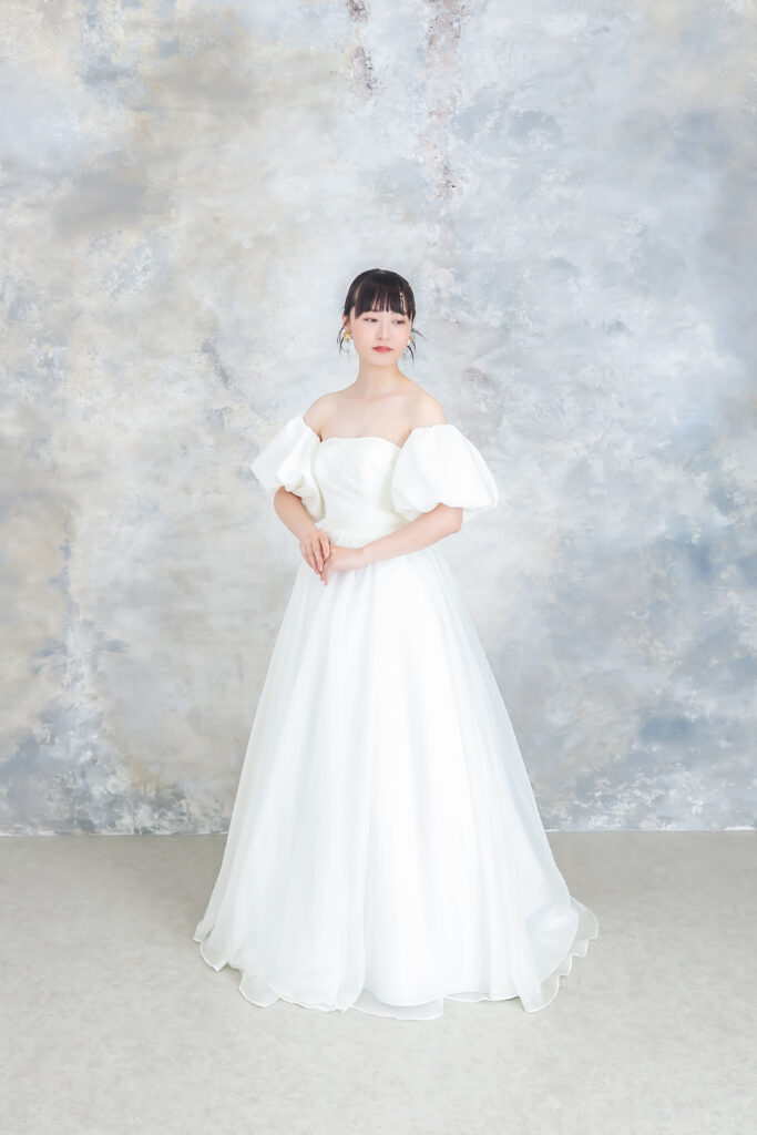 ふんわりとしたパフスリーブが愛らしいドレス。 シンプルなAラインに柔らかなオーガンジー素材が重なり、軽やかでロマンティックな印象を演出します。 ナチュラルな可憐さを求める方におすすめです。