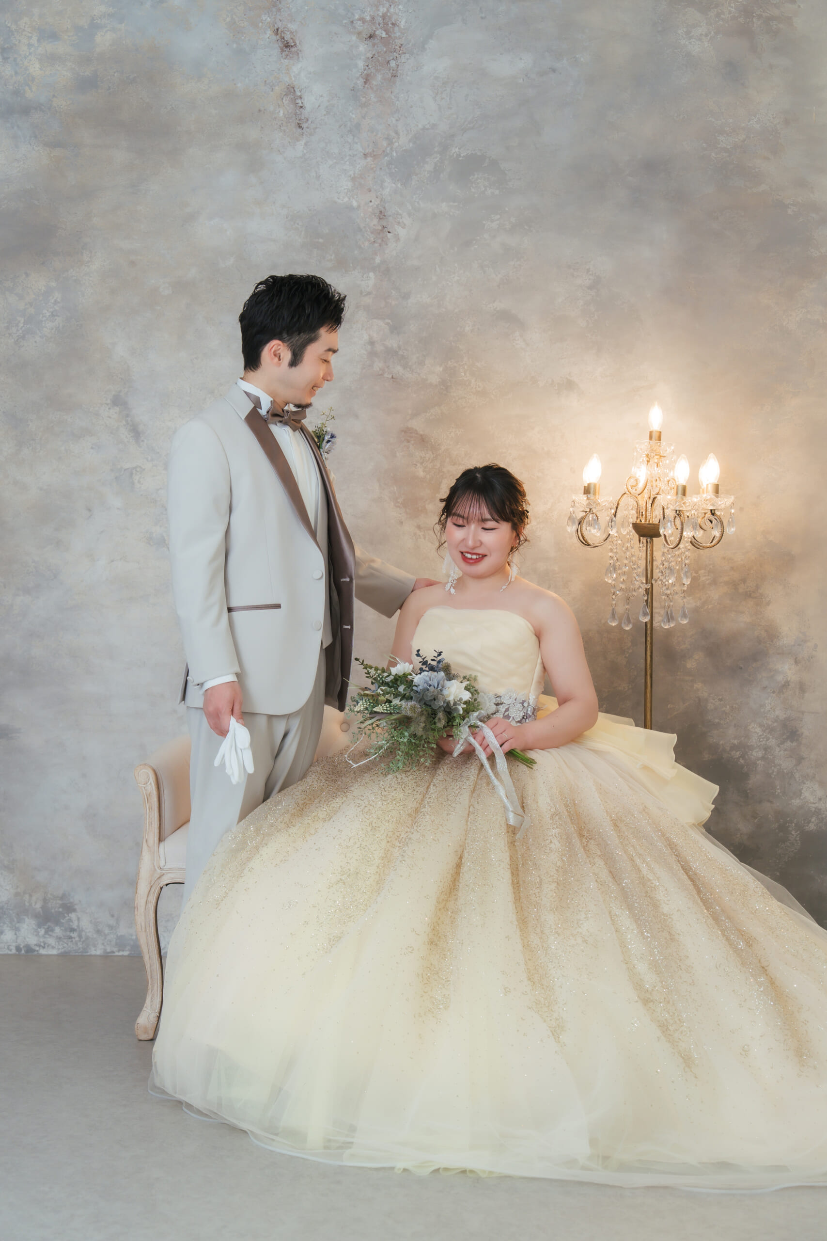 - ソファーに座ることにより、ドレスの質感をいかした一枚となりました。