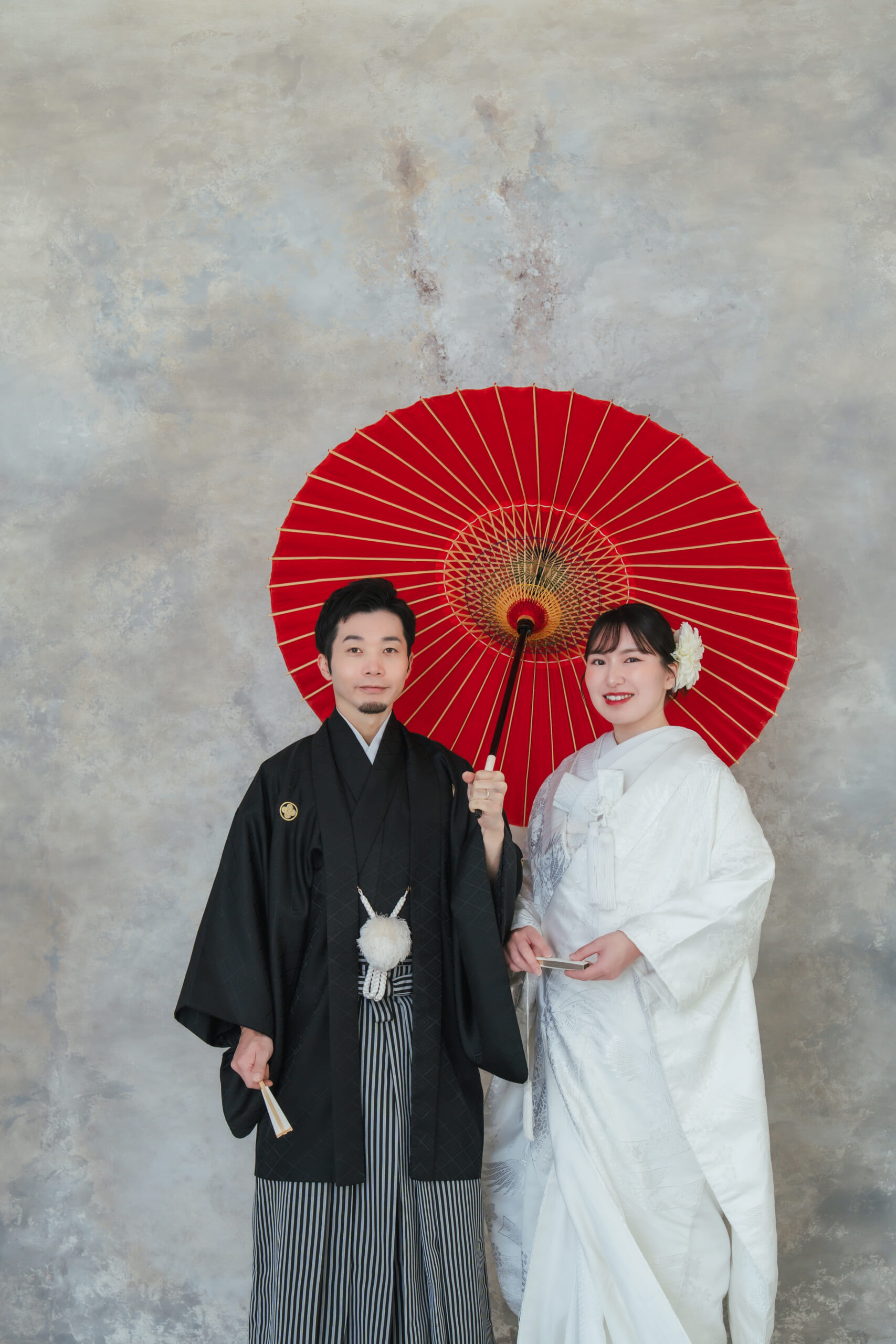 - 白無垢に映える、真っ赤な番傘を使用しての一枚です。
