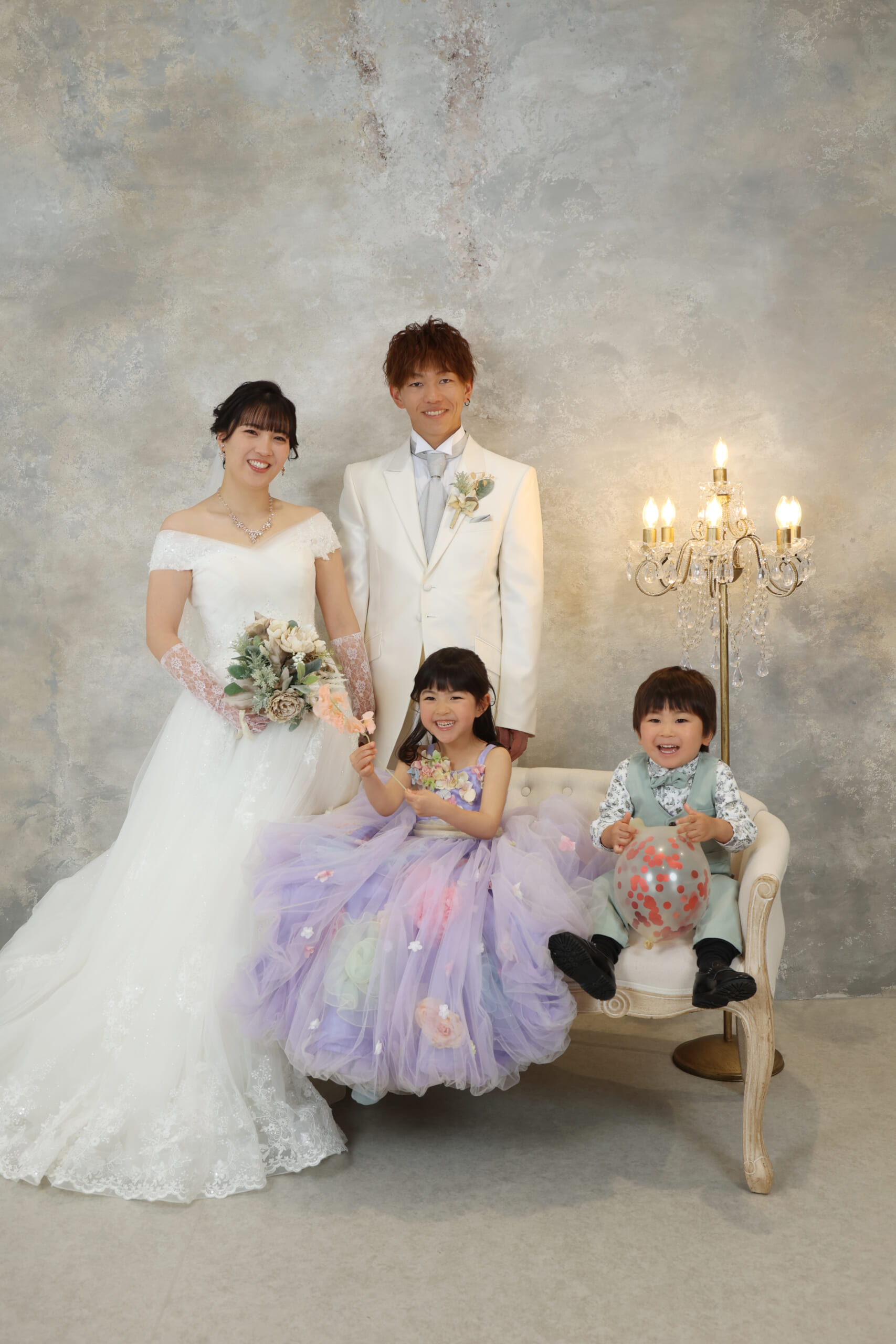 - ご新婦様に座ってもらおうかと思っていたら、お子様たちが先に笑顔でソファーに座ってくれました。