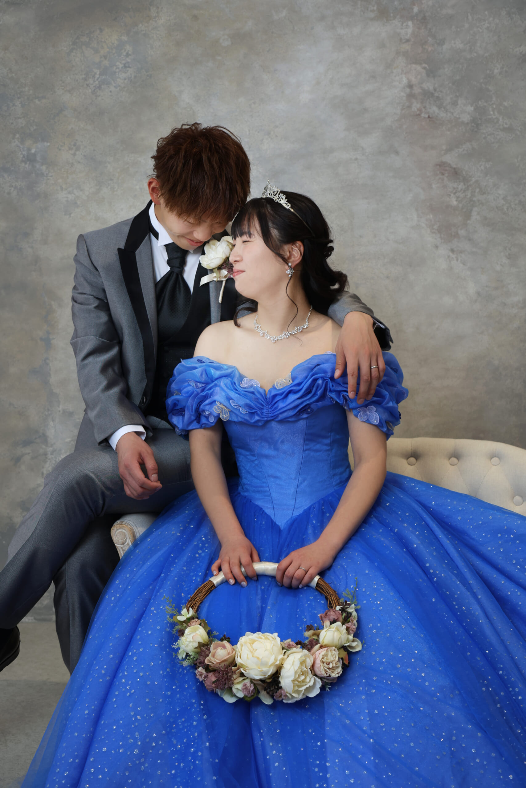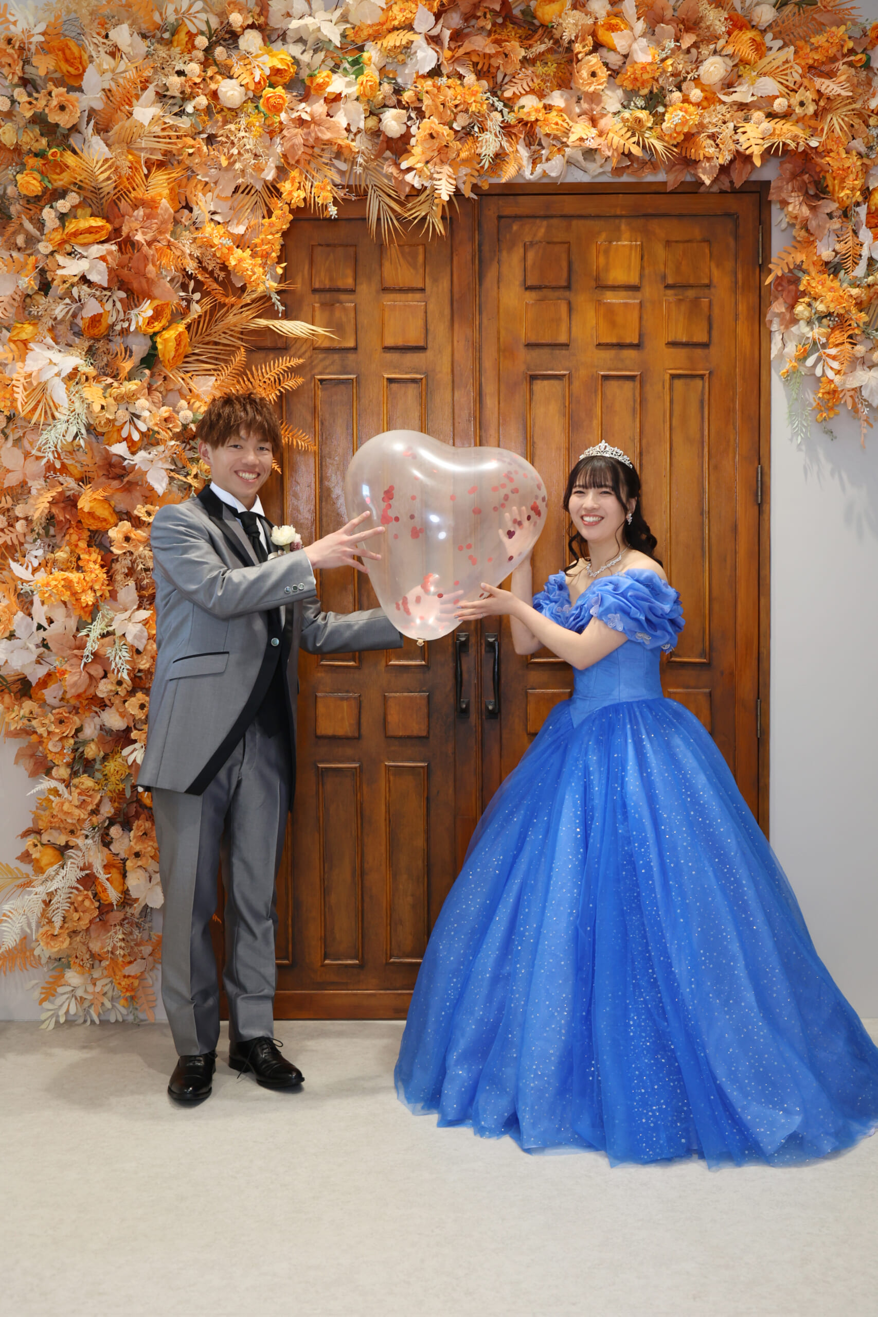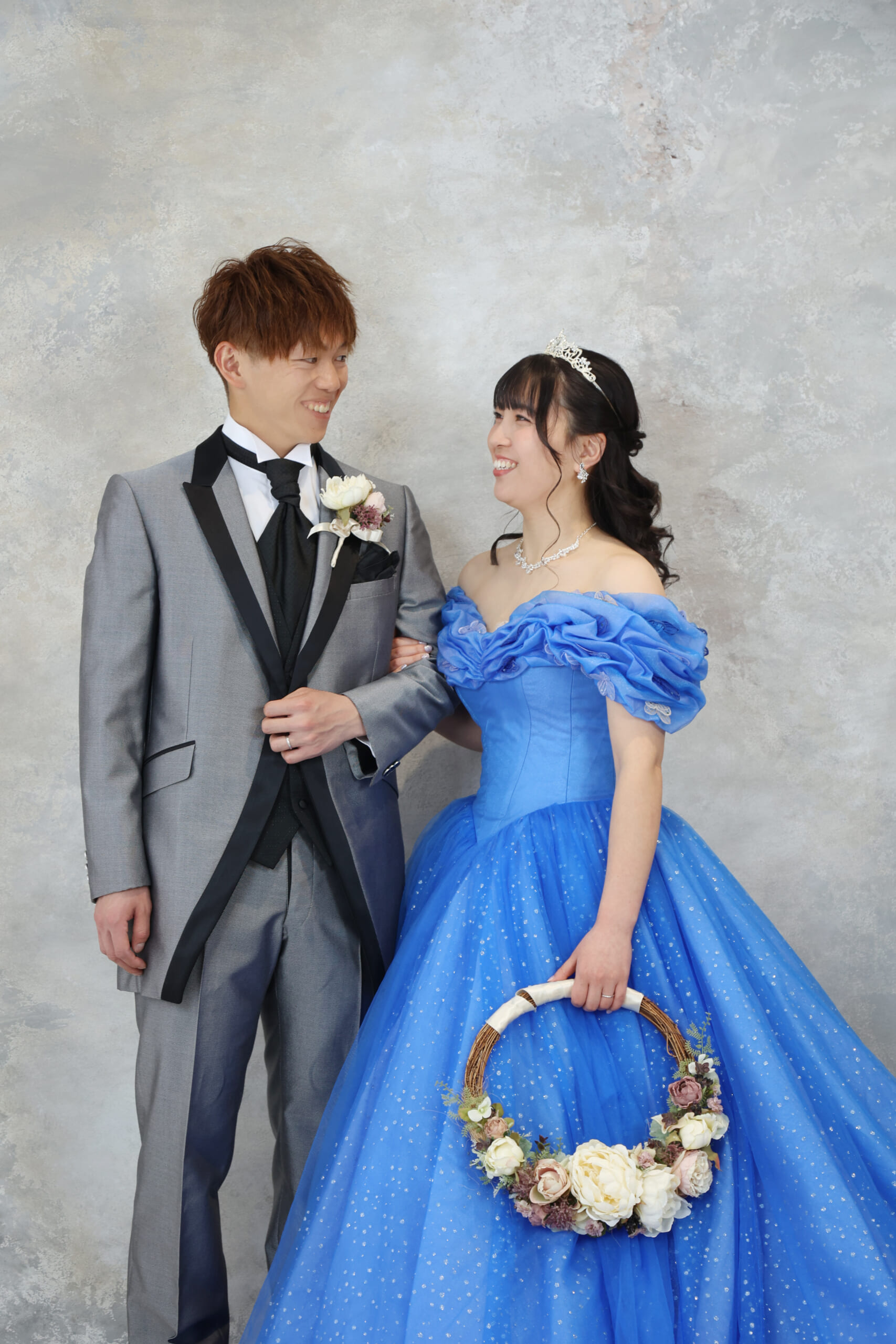 - 2着目は鮮やかなブルーのカラードレスと、シルバーのタキシードで雰囲気をガラリを変えて撮影を行いました。
