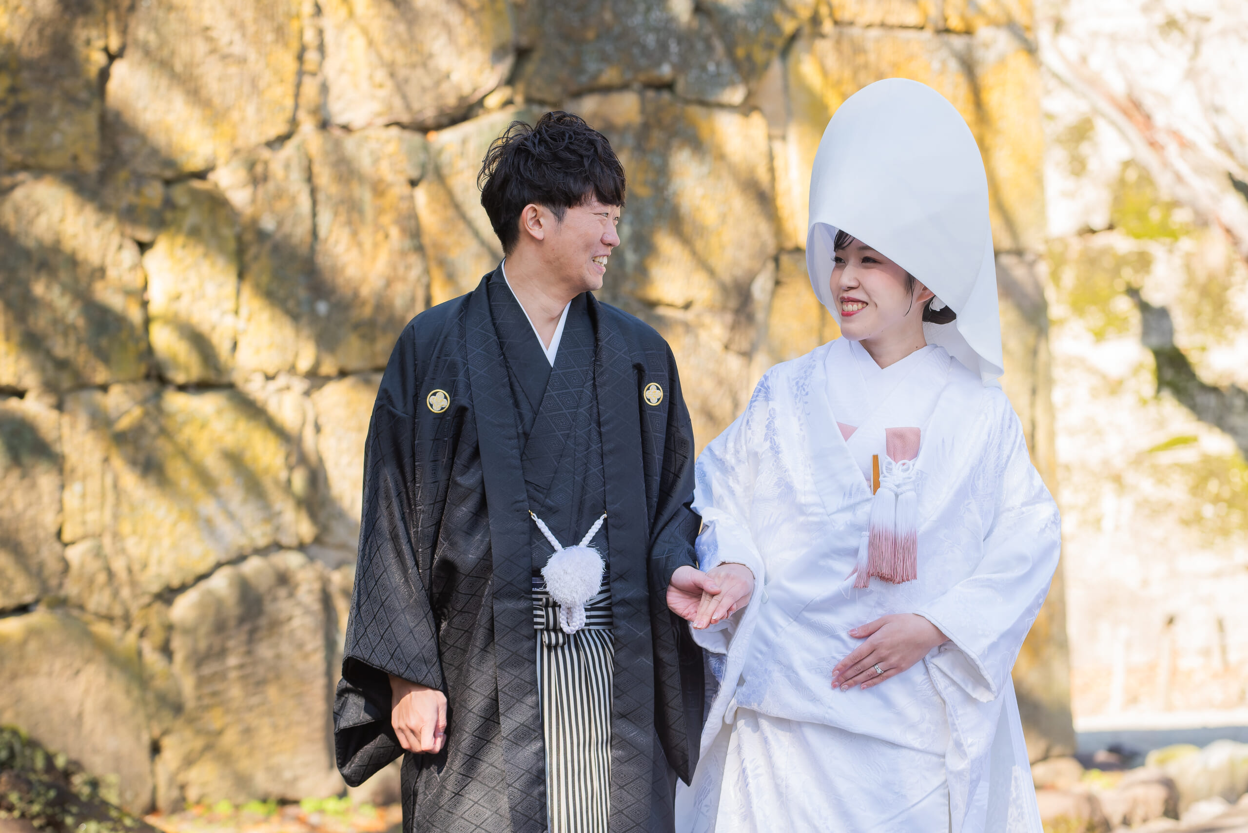 - 石垣の道を、ゆっくりと。 手を取り合うその歩幅が、 これからの人生そのもの。