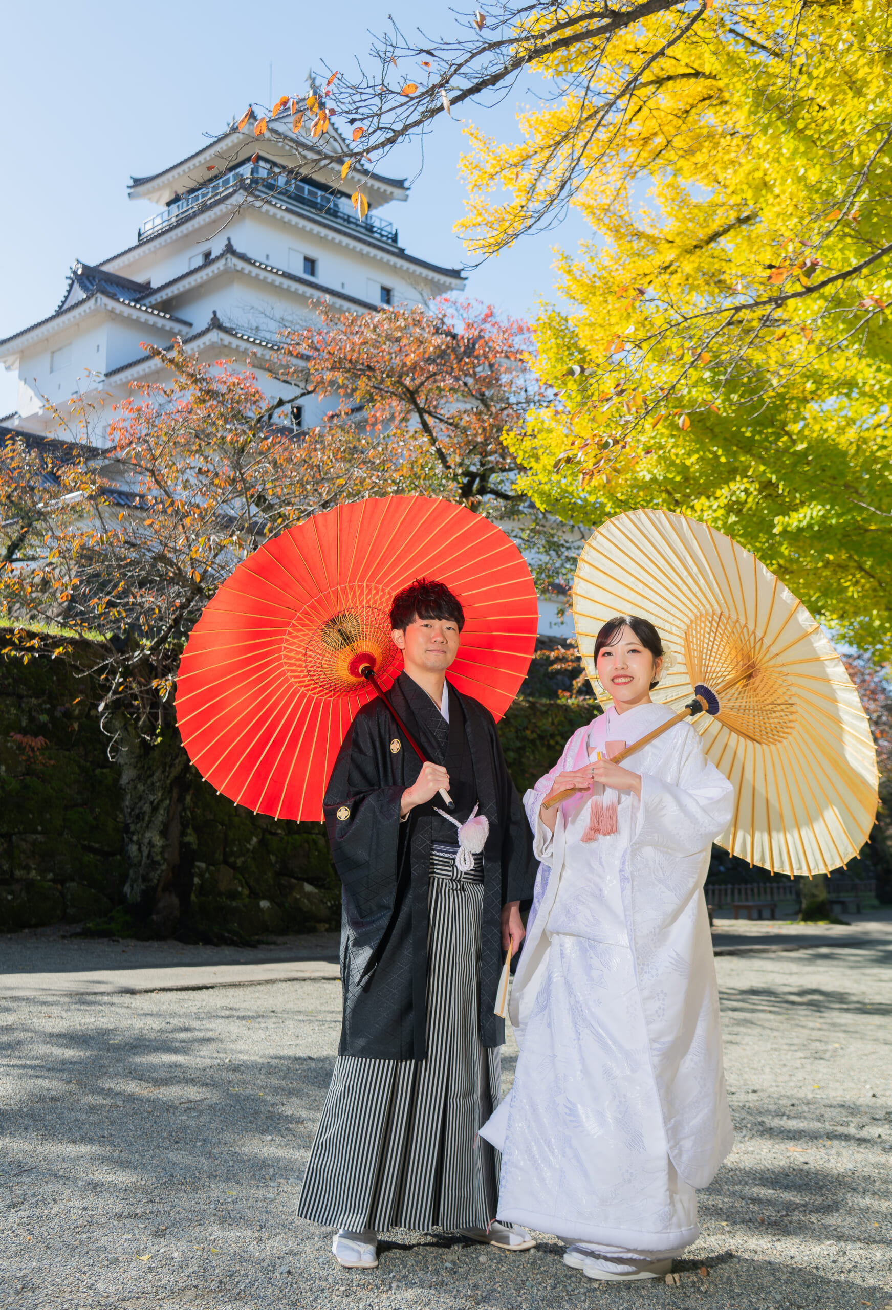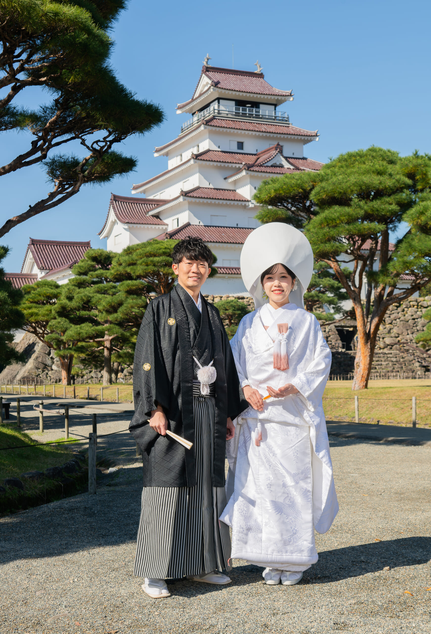 - 凛と佇む鶴ヶ城。 その前に立つ、白無垢と黒紋付。 静かに、でも確かに始まる物語。