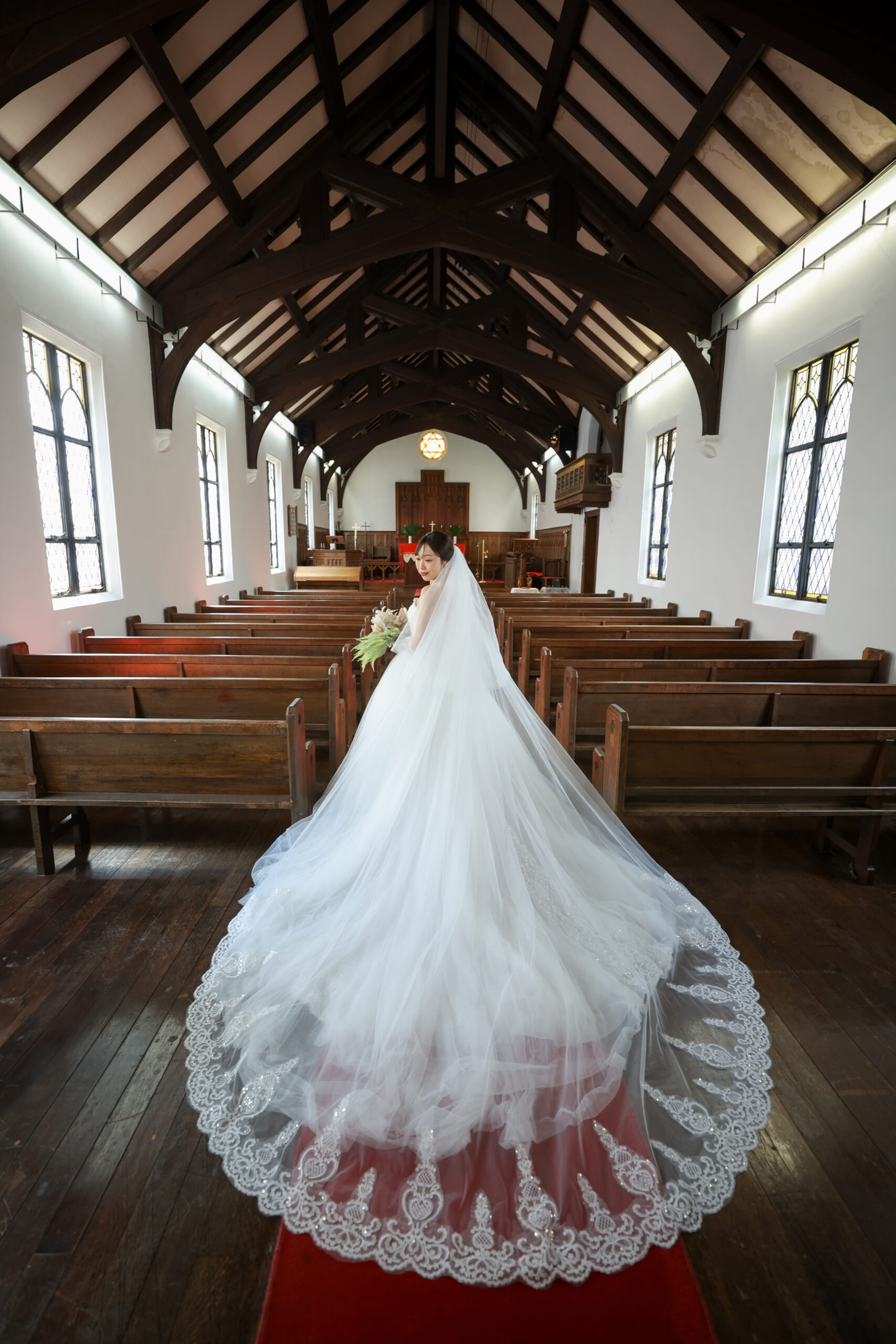 - 場所を教会にうつしての撮影。ロングベールからの振り返りショットがとても美しいです。
