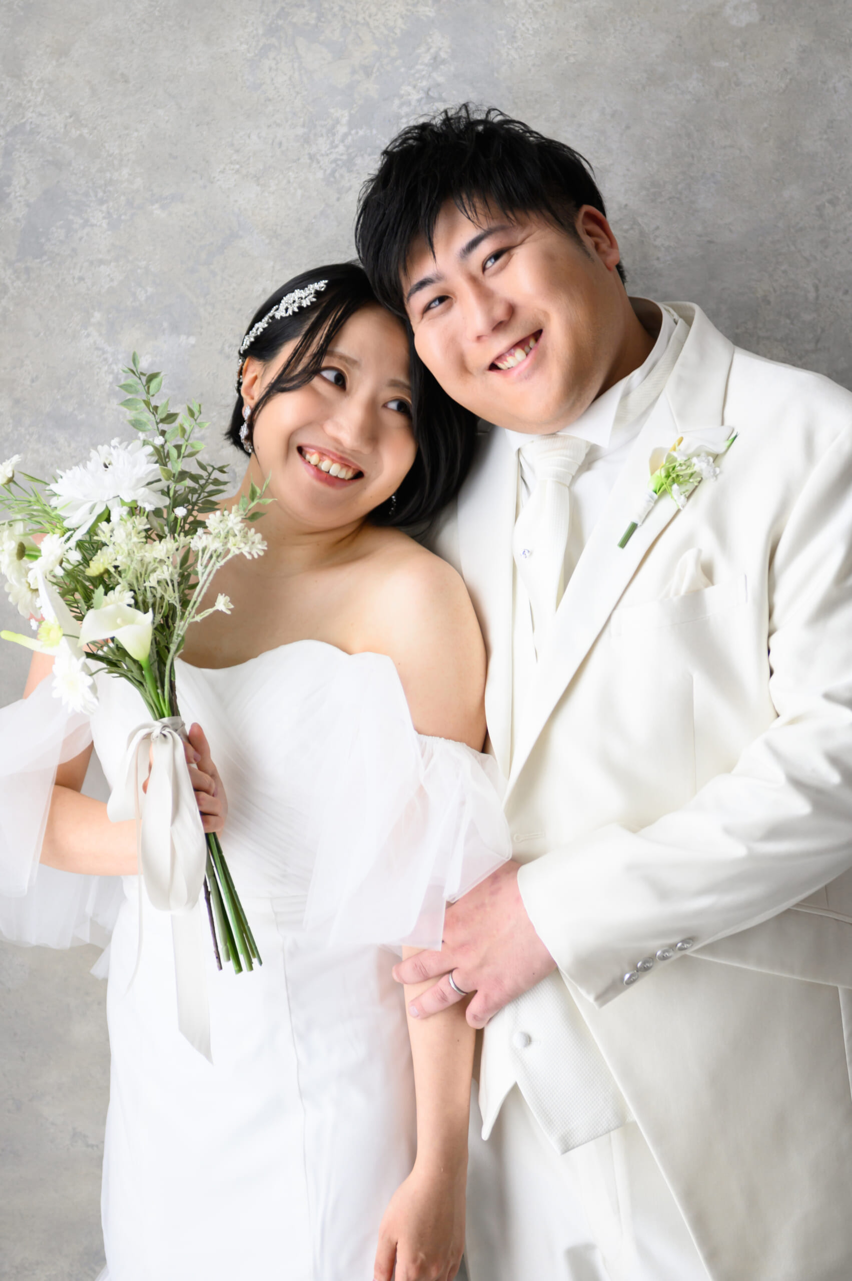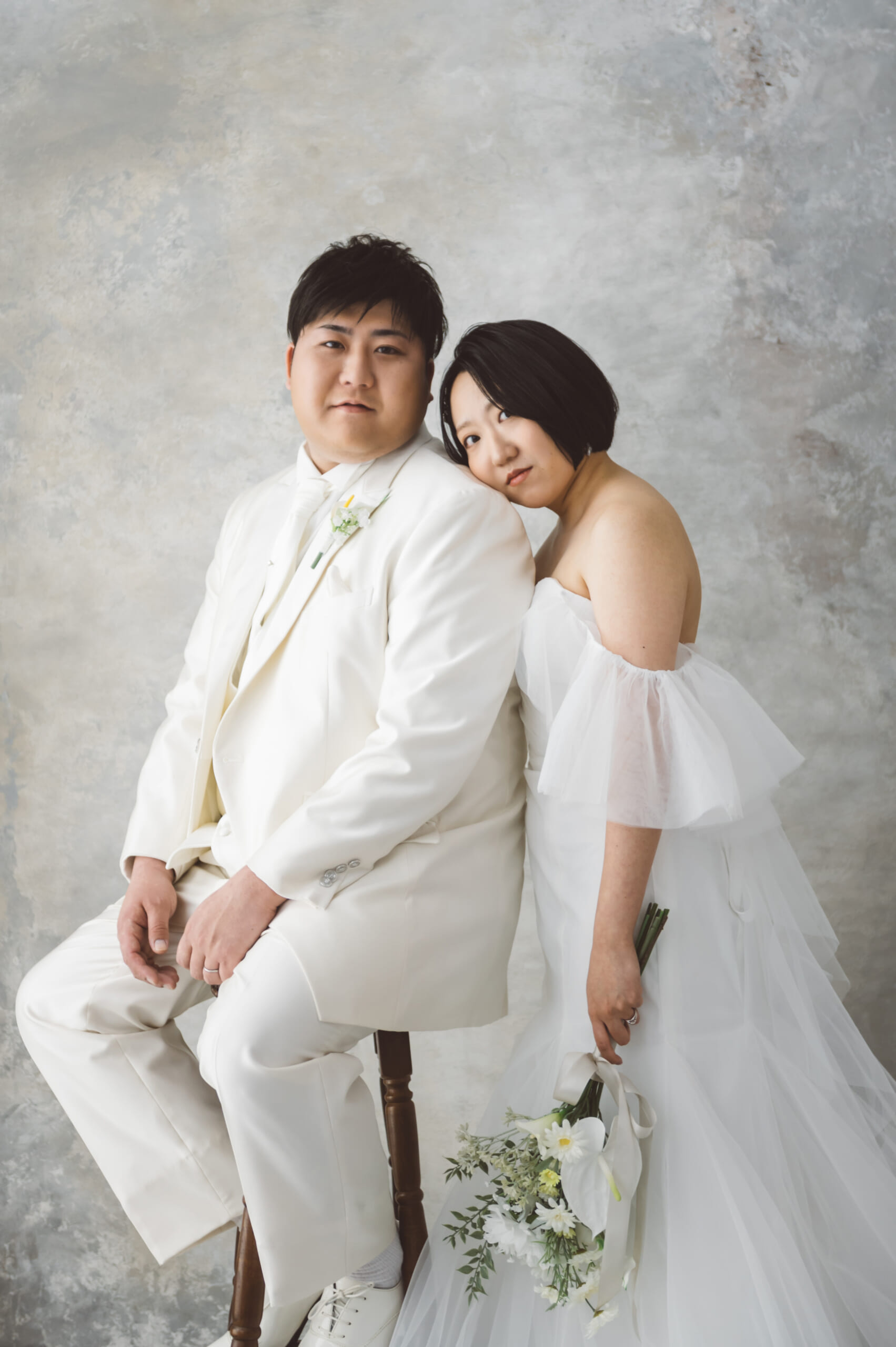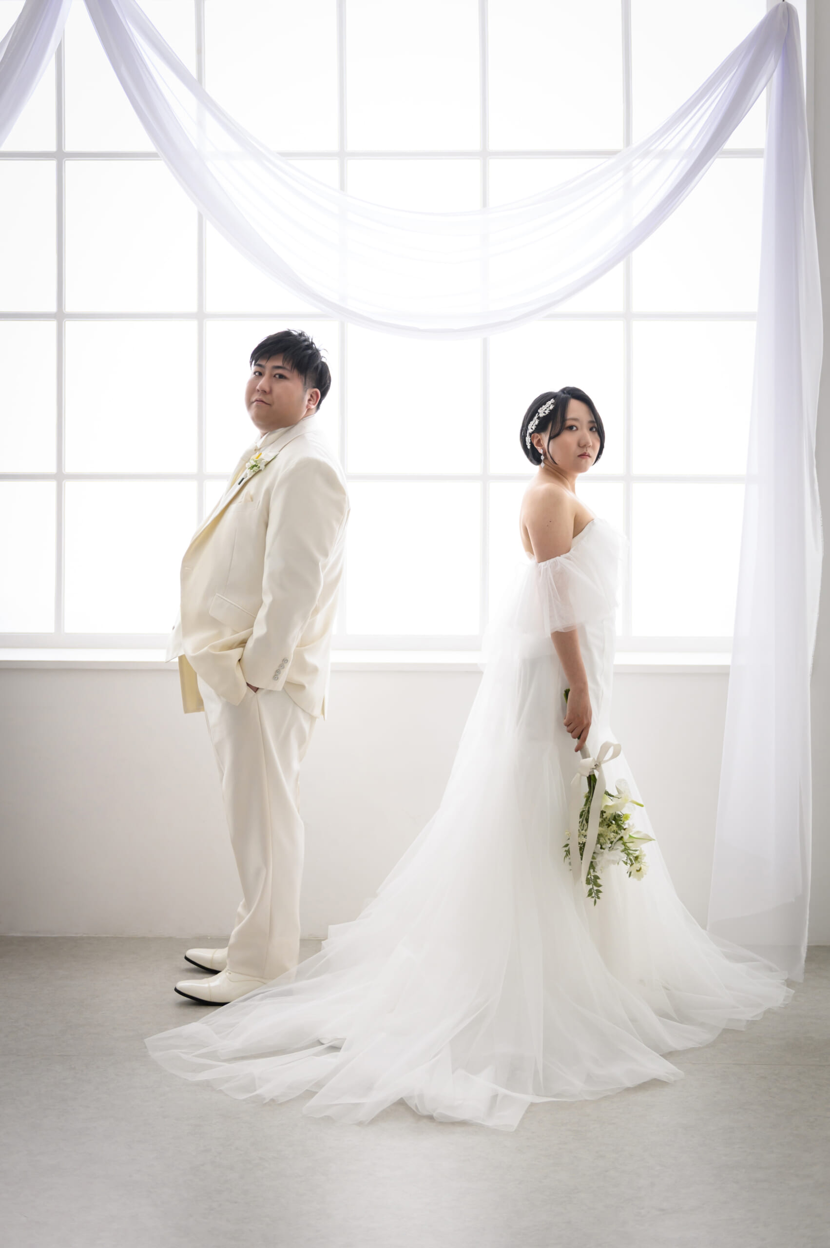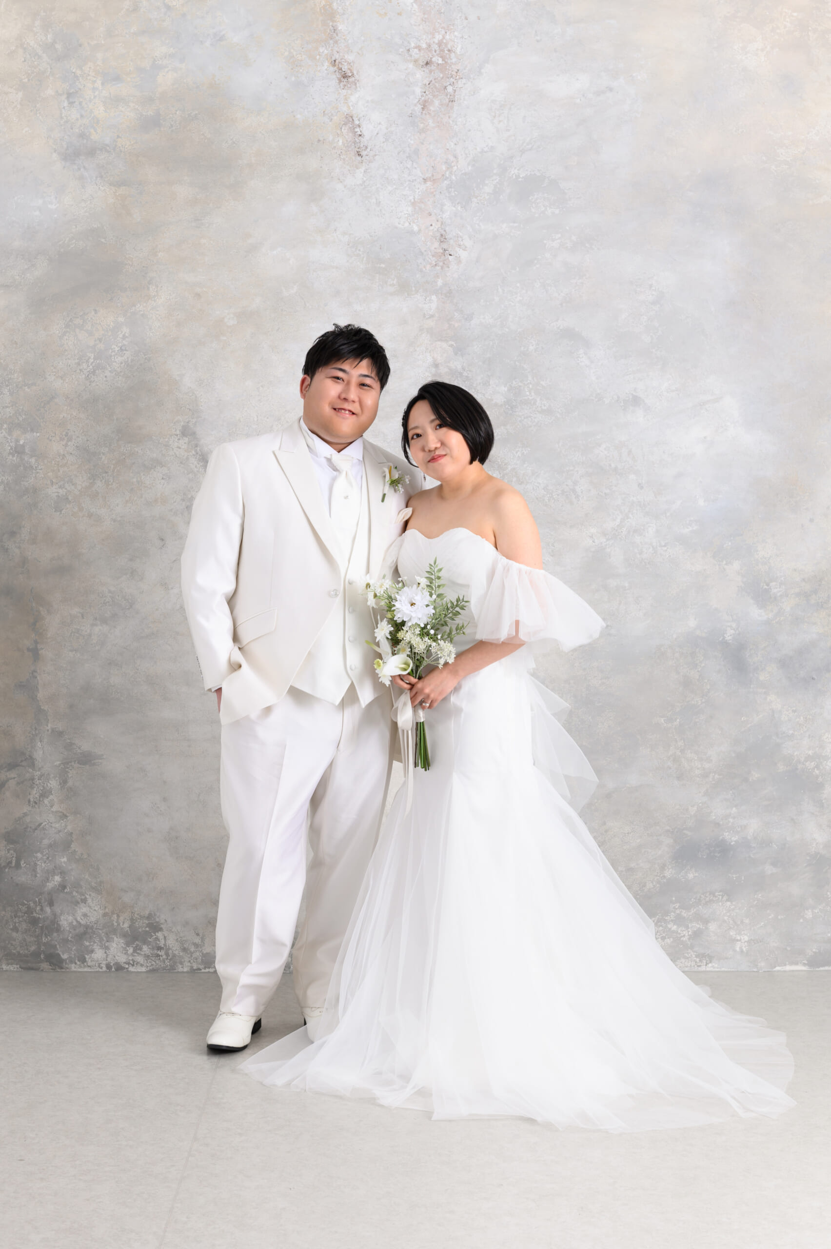 - タキシード、ウェディングドレス、ブーケ、背景も白に統一された一枚です。