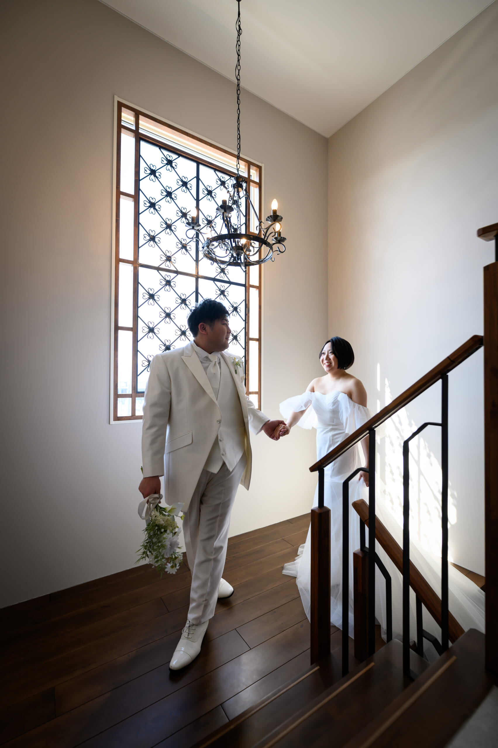 - 自然光が差し込む場所で、ご新郎様のエスコートをされた一枚を撮影いたしました。