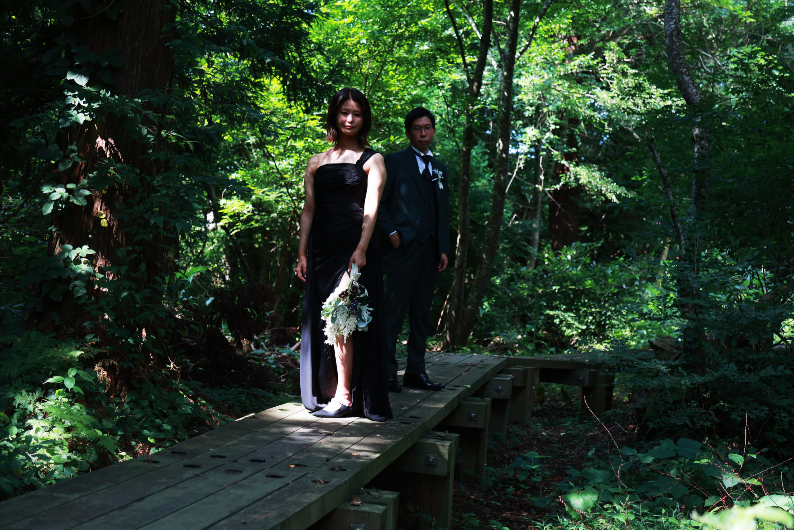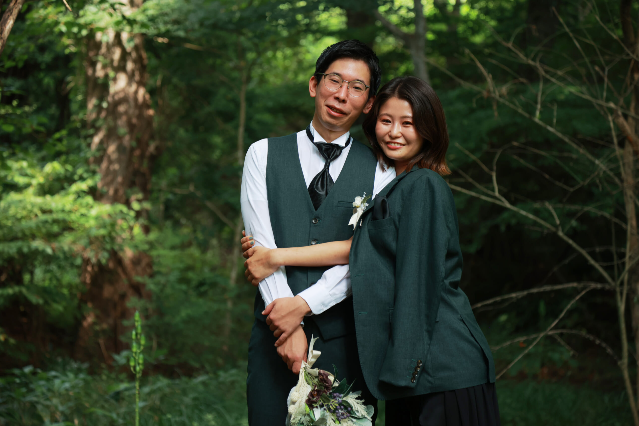 - 木々の緑とグリーンのタキシード。新郎様のジャケットを新婦様が羽織って撮影をしました。