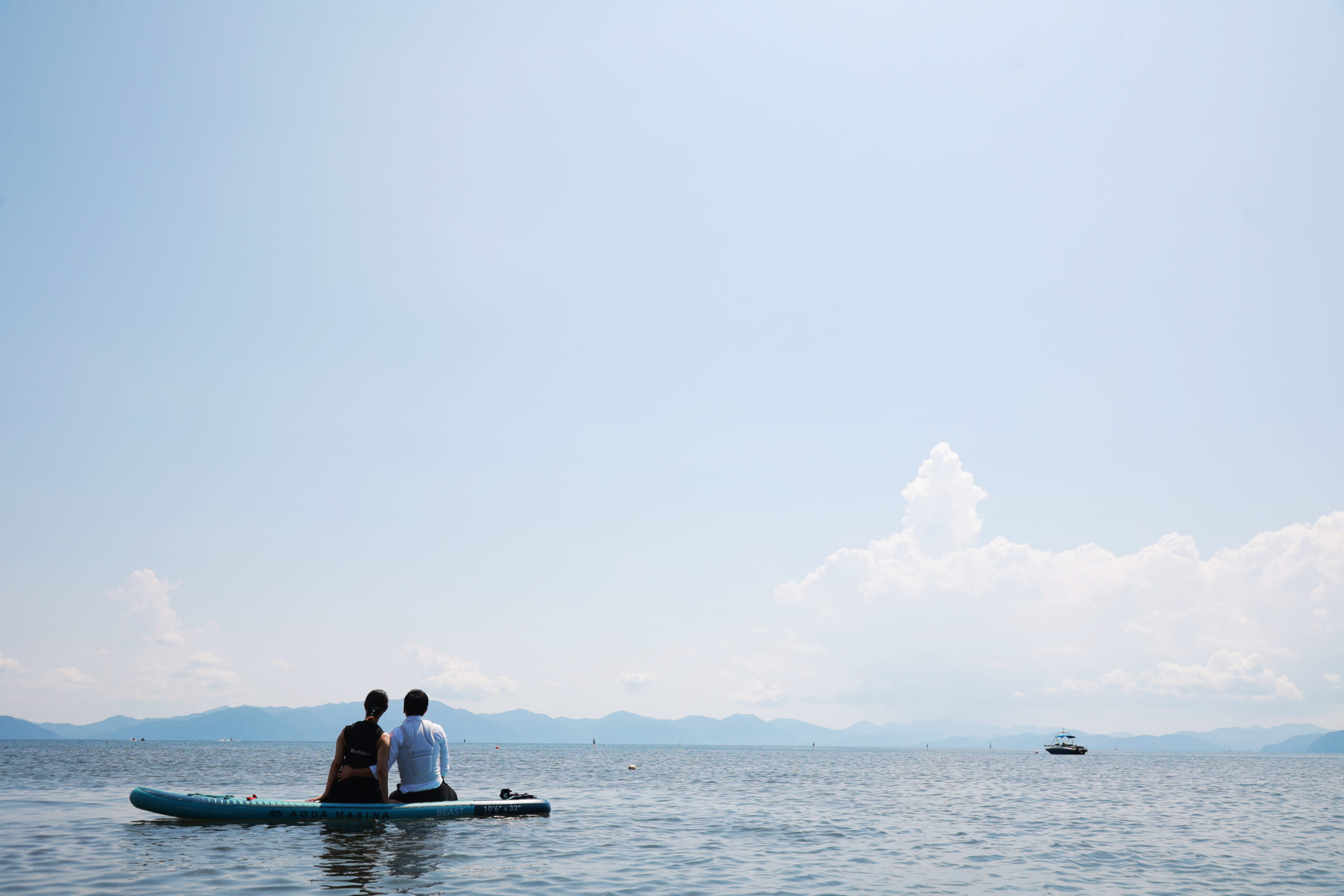 - 次にサップに乗っての撮影を行いました。奥には入道雲もあり、夏の雰囲気たっぷりな一枚となりました。