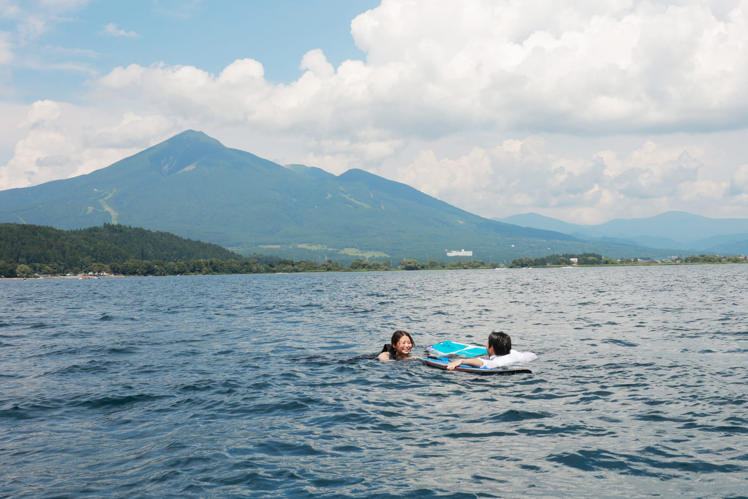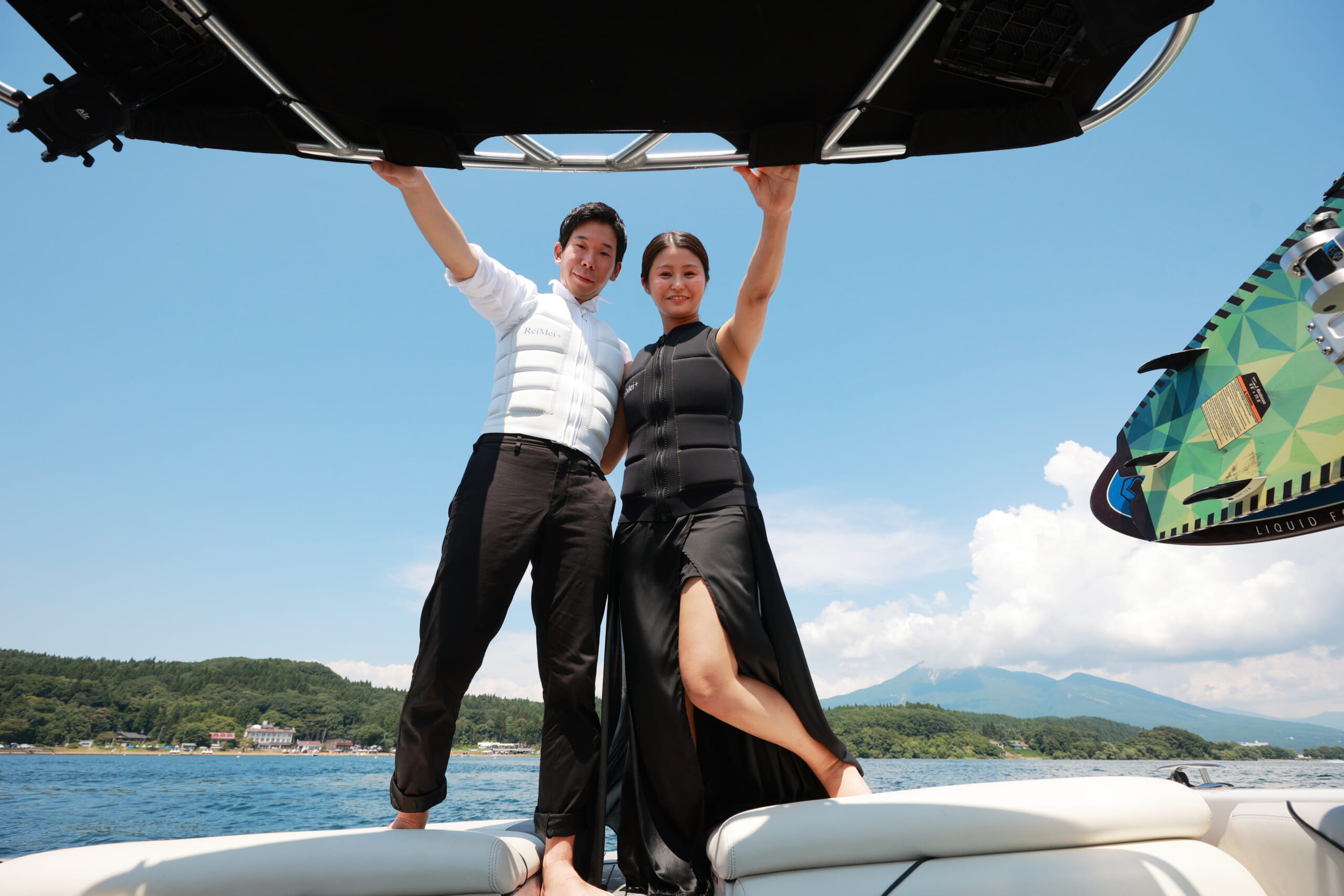 - ウェイクサーフィンの撮影が成功して、ほっとした表情のお二人と磐梯山。