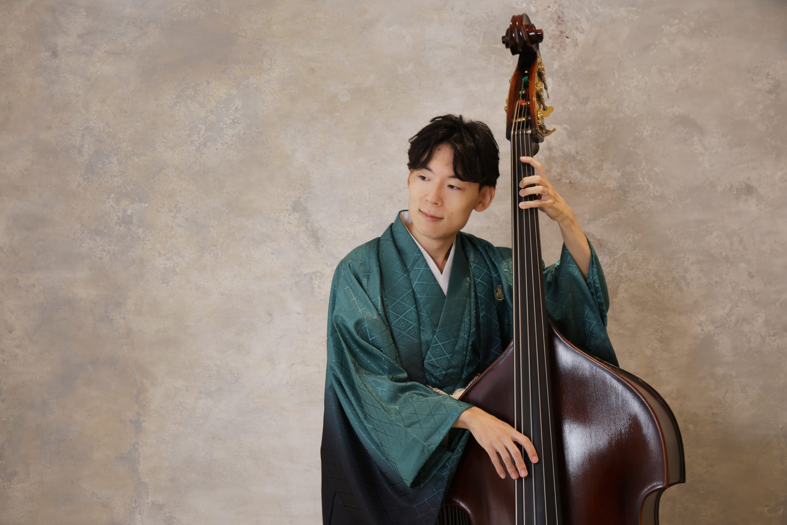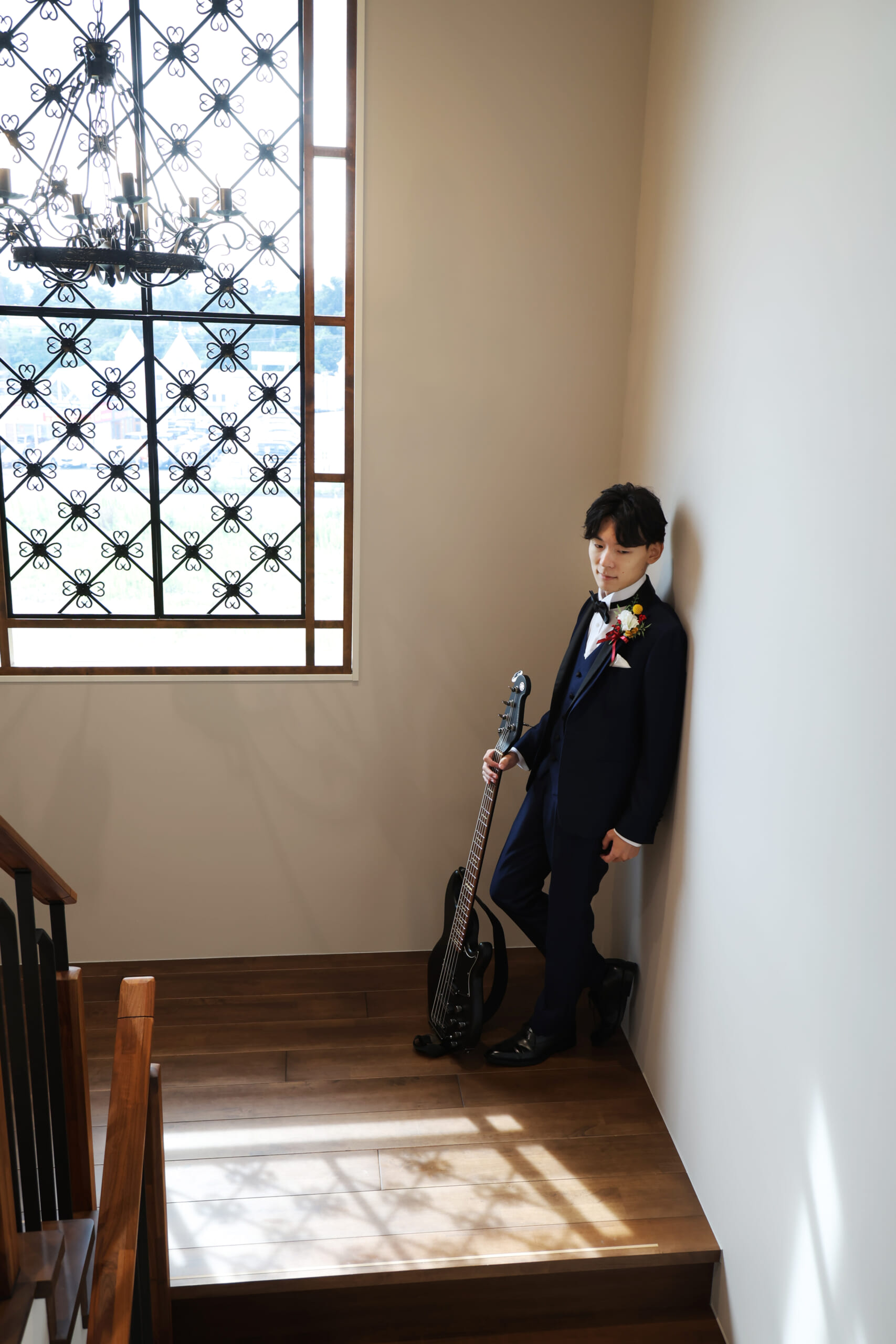 最初はご新郎様のソロショットから。お持込みのコントラバスと一緒に。