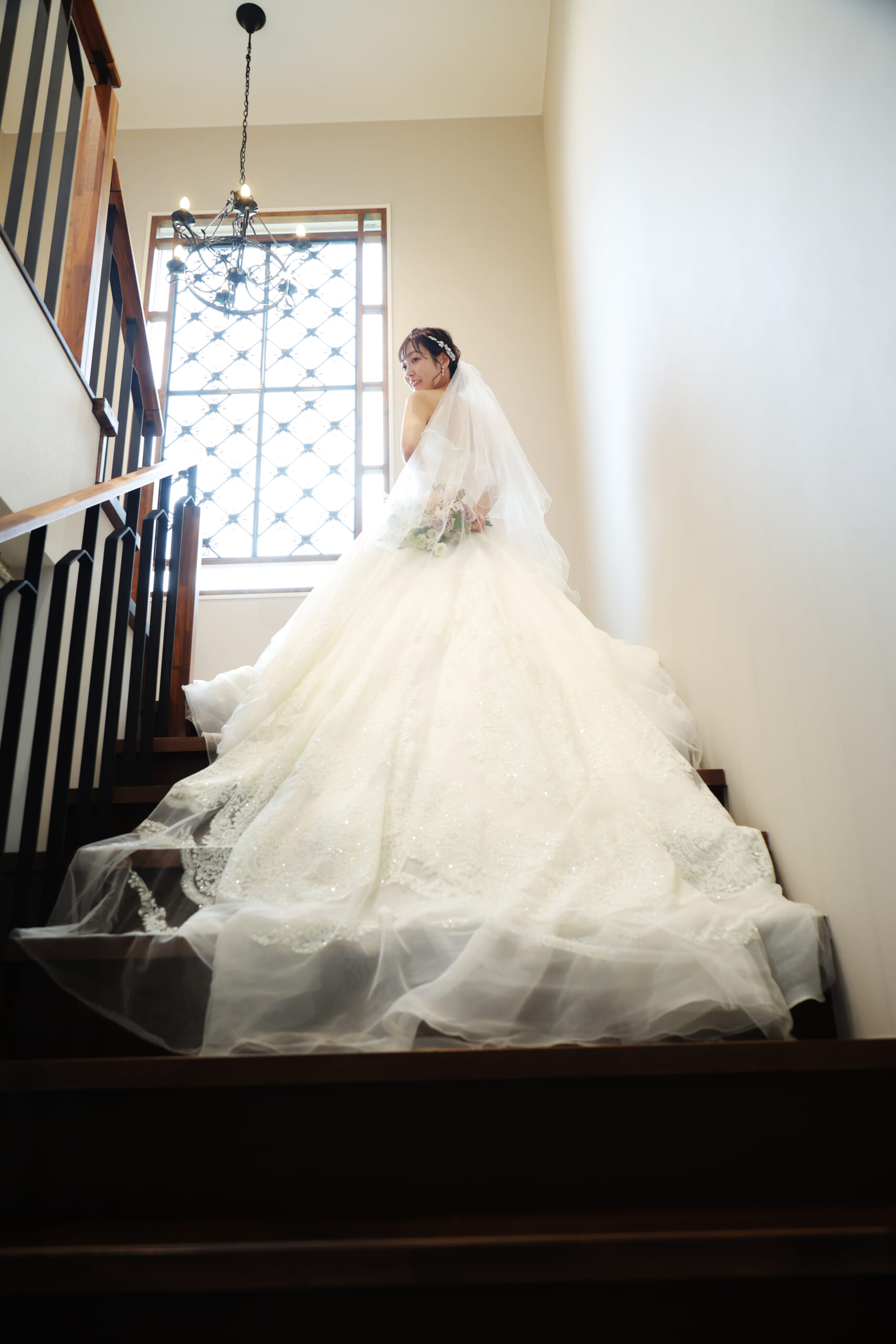 トレーンの長いドレスだったので、階段の段差を利用してもの撮影を行いました。