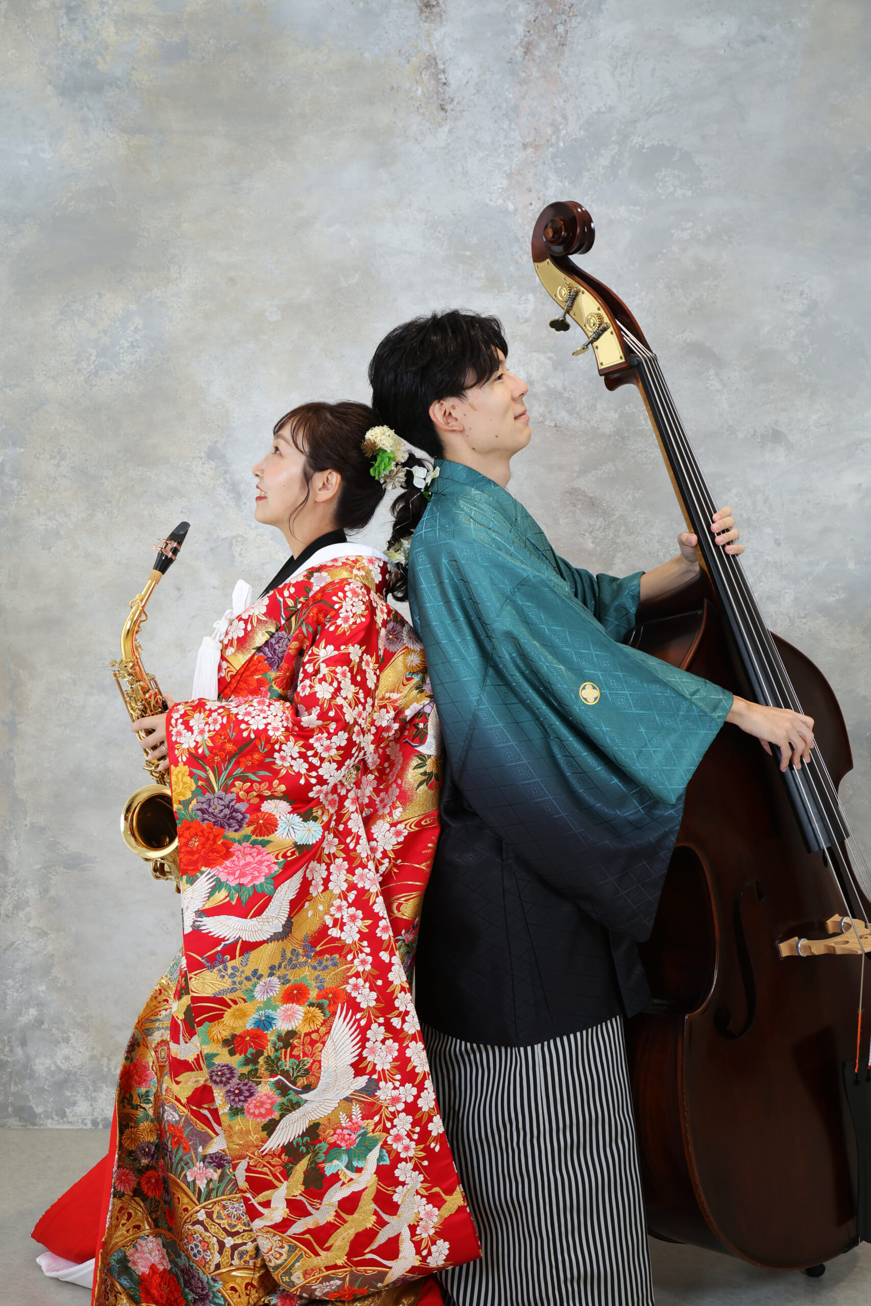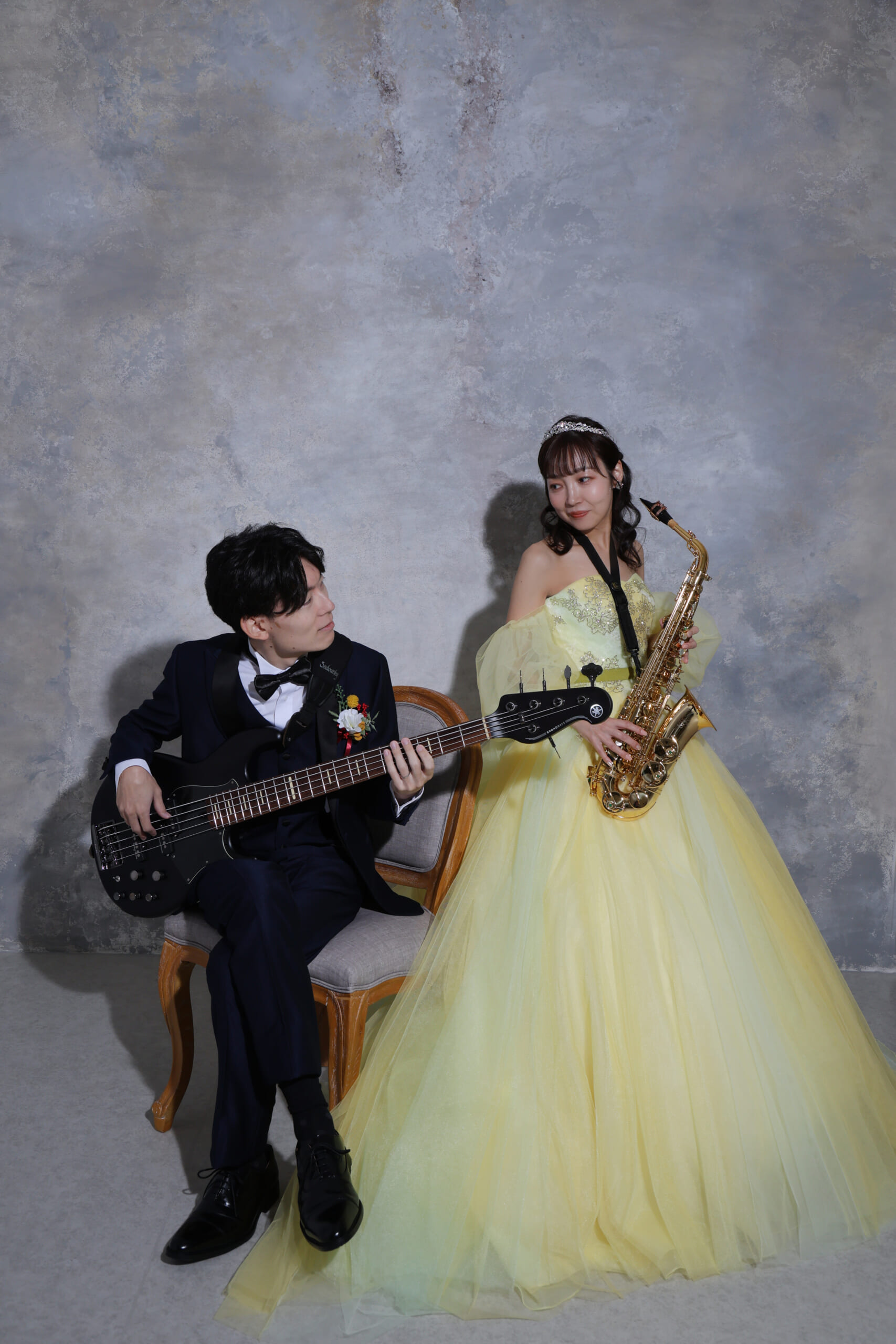 ご新郎様はコントラバス、ご新婦様はサックスと一緒に撮影しました。